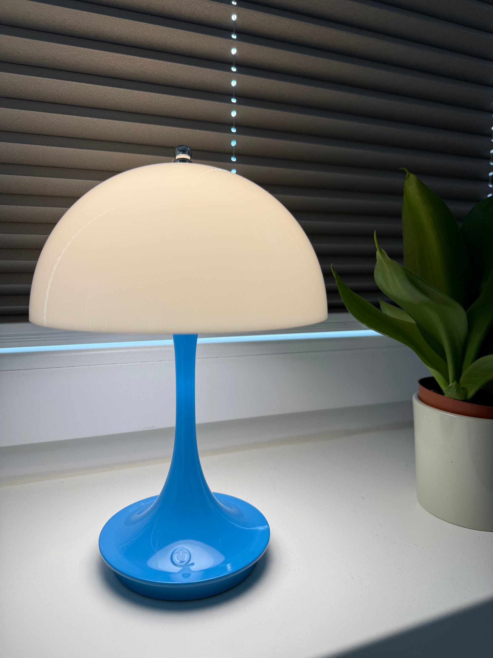Die BlueShroom Light – Design-Akku-Pilzlampe verbindet modernes Design mit praktischer Funktionalität. Ihr zarter, hellblauer Fuß sorgt für einen stilvollen Akzent, während die sanfte LED-Beleuchtung ein gemütliches Ambiente schafft.