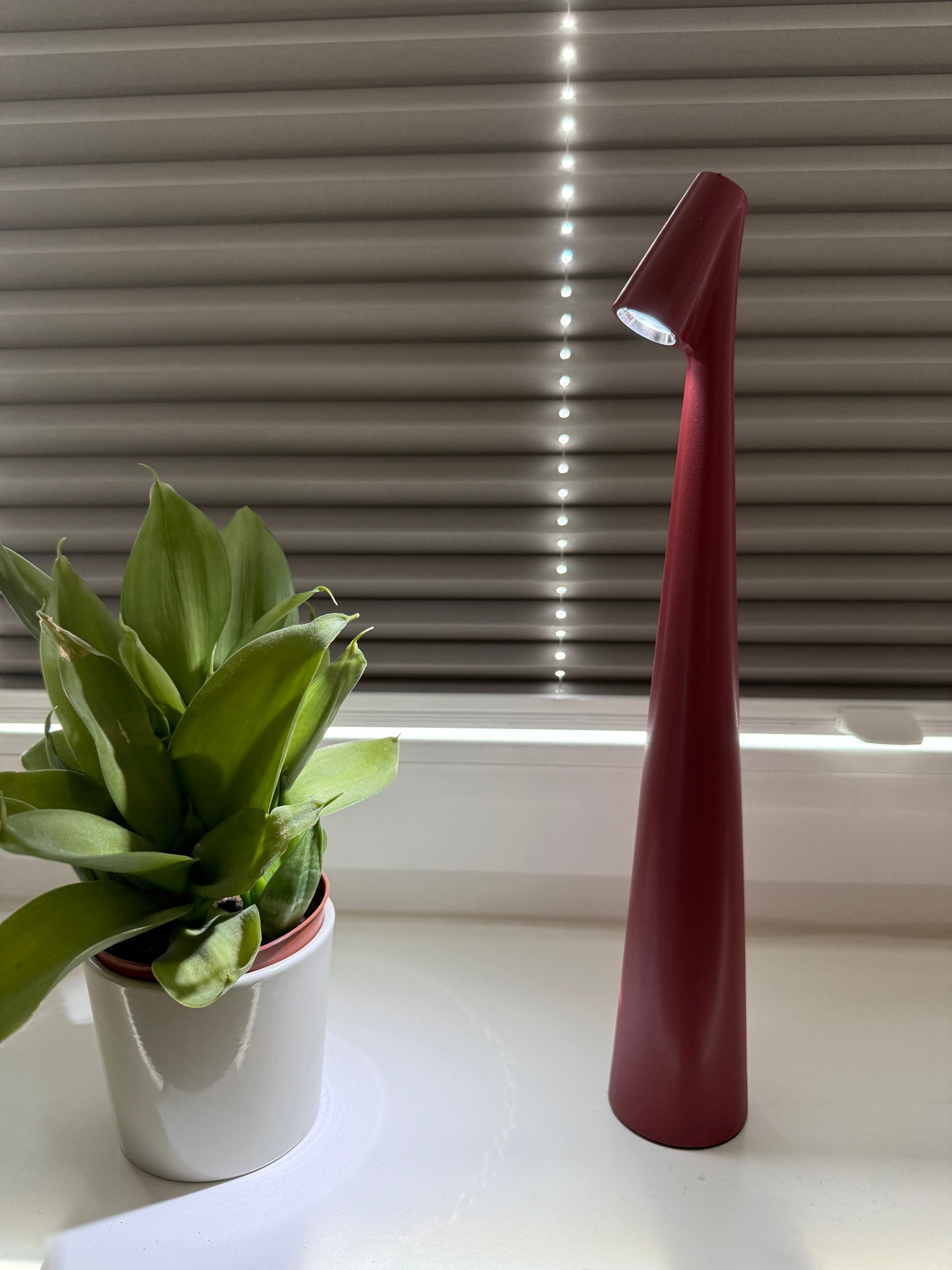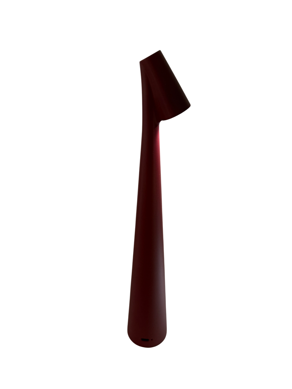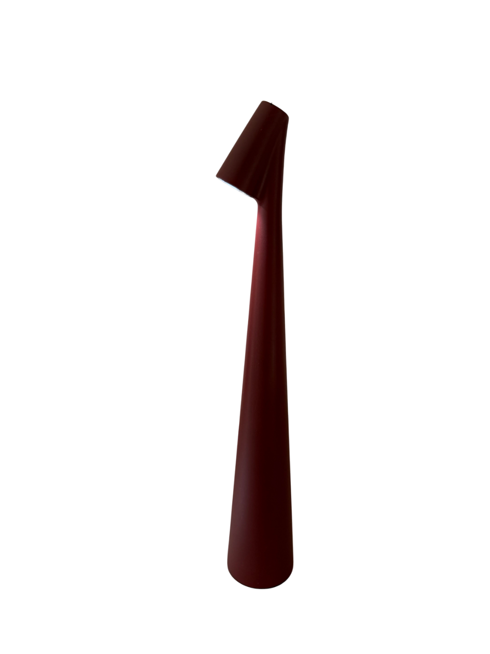 Minimalistische Form, intensives Rot, angenehmes Licht. Akku-betrieben flexibel einsetzbar auf Esstisch, Terrasse oder als Deko-Element.